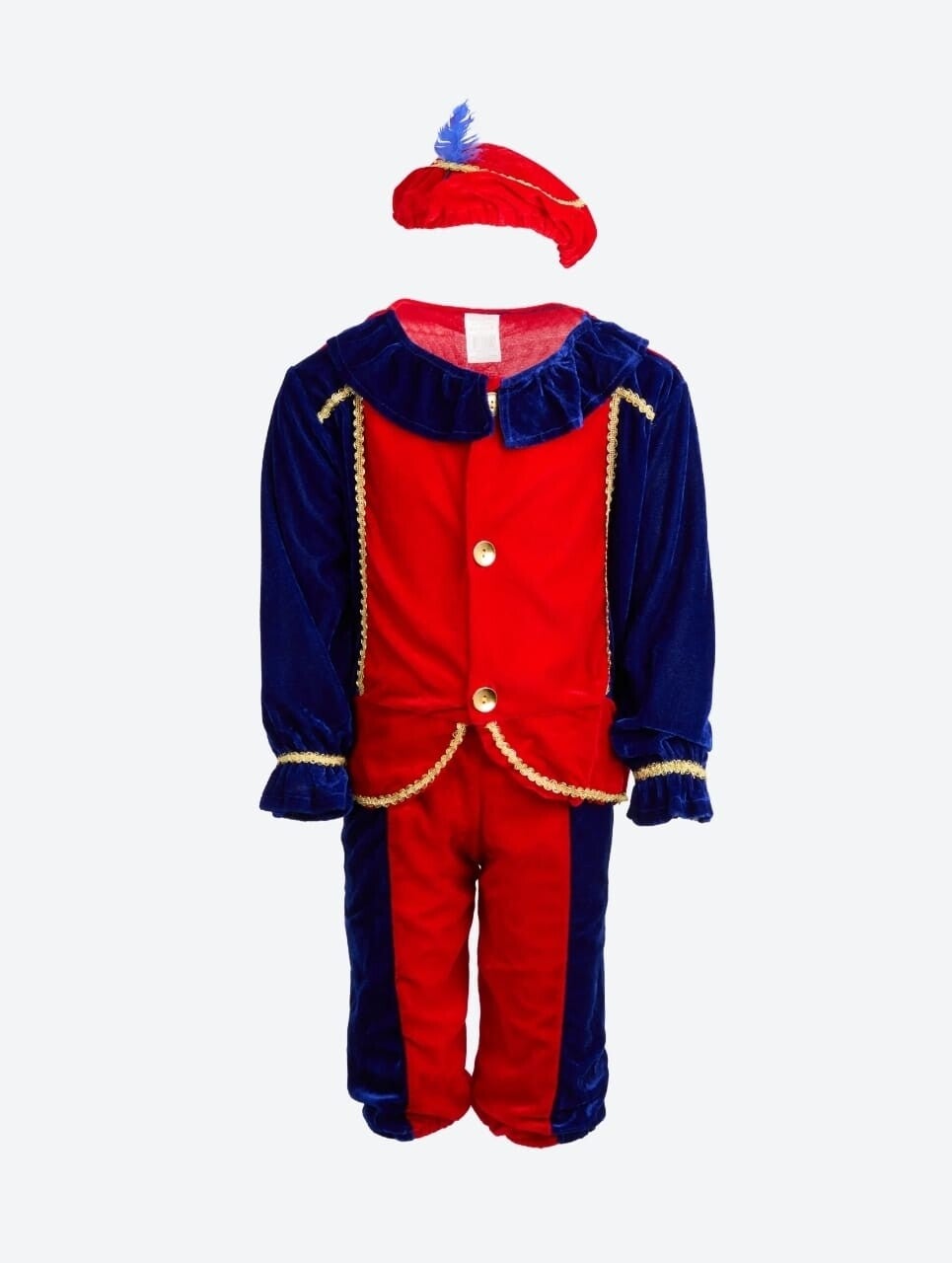 Pietenpak met naam van het hulppietje. Pakken in verschillende kleurstellingen en in twee maten beschikbaar. Pak bestaat uit jasje, broek en muts met veer.