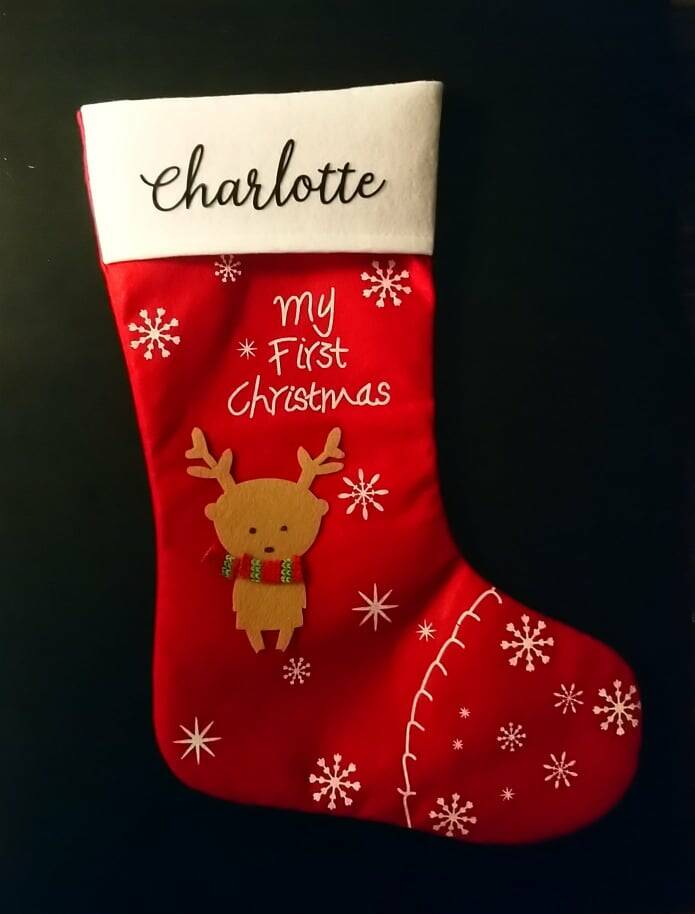 Kerstsokken gepersonaliseerd met naam.Lettertype kan naar wens aangepast worden, de naam kan ook in verschillende kleuren.