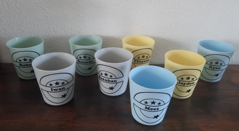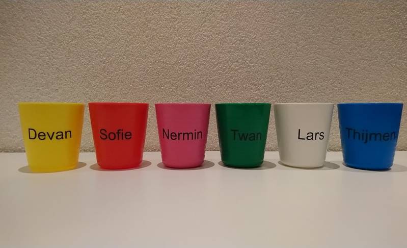 Bekers in zes verschillende kleuren (willekeurig, we kunnen wel rekening houden met voorkeuren.)